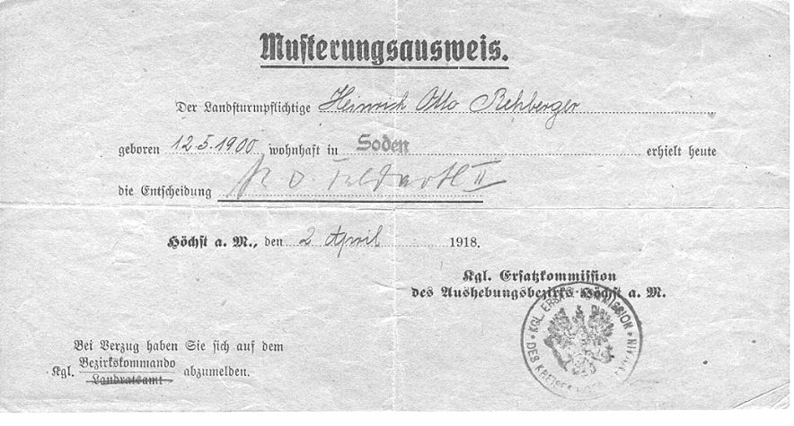 dok149 1918 Musterungs-Ausweis mit Ergebnis kv (kriegsverwendungsfähig) Feldartillerie