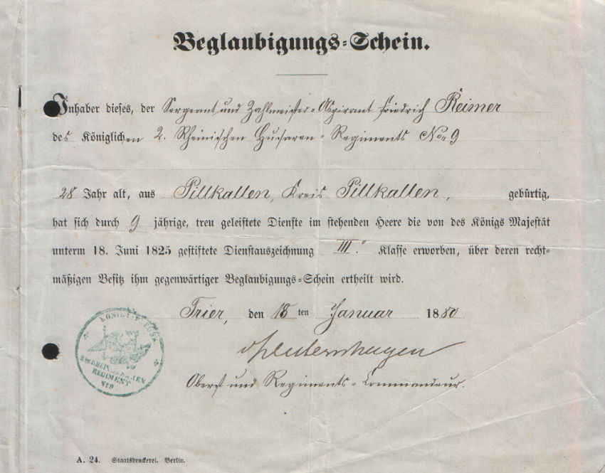 an einen Sergeanten des (2. Rheinischen) Husarenregiments Nr. 9