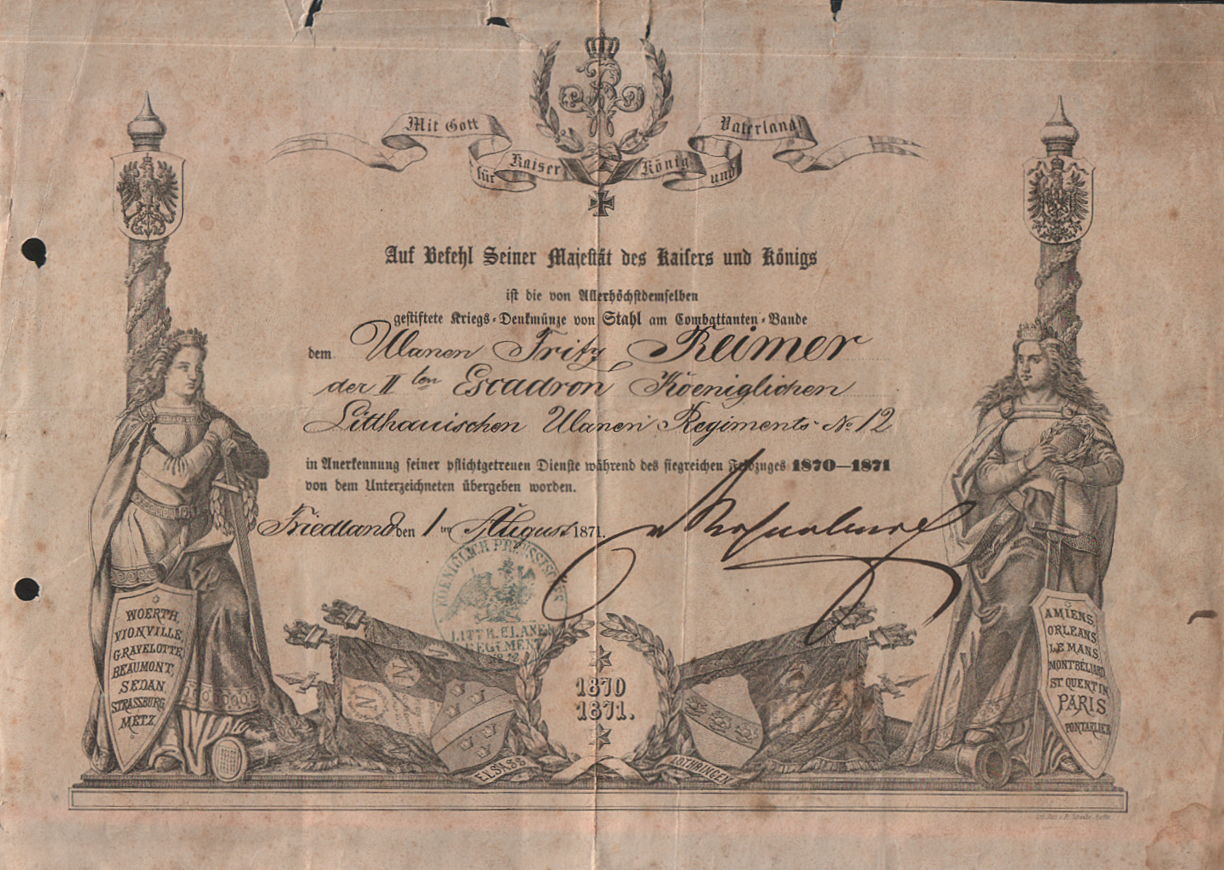 dok1631871 Verleihungsurkunde der Kriegsdenkmünze 1870/71 an einen Uhlanen