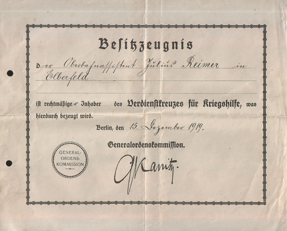 dok164 1919 Besitzzeugnis des Verdienstkreuzes für Kriegshilfe für einen