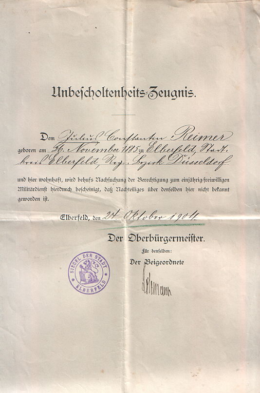 dok165a 1904 Unbescholtenheits-Zeugnis für einen Einjährig-Freiwilligen