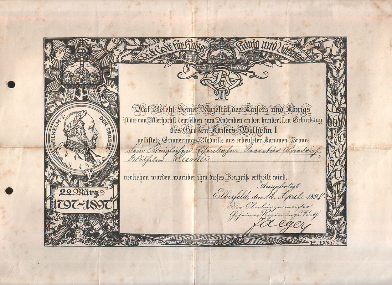dok167 1898 Verleihungsurkunde der Cenntenar-Medaille an einen kgl-preuß. Eisenbahn-Sekretär