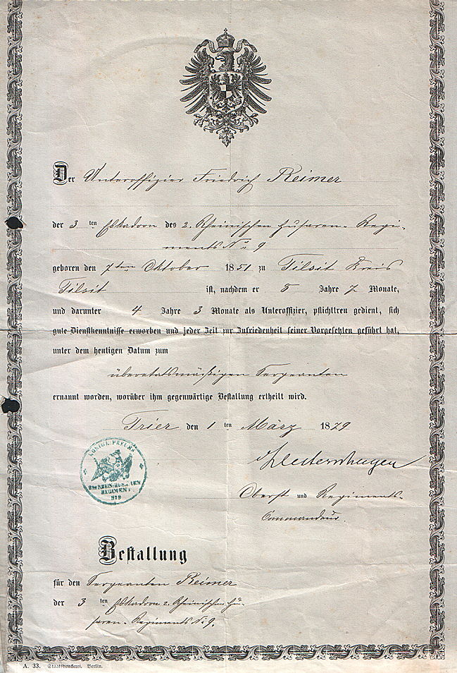 dok168 1897 Bestallungsurkunde eines Uffz. des (2.Rhein.) Husaren-Regiments Nr. 9 zum Sergeanten