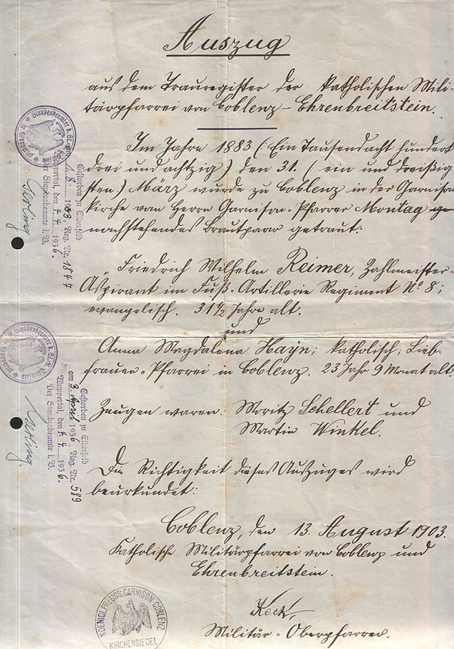 dok169 1883 Auszug aus dem Trauregister über die Militärtrauung eines Zahlmeister-Aspiranten