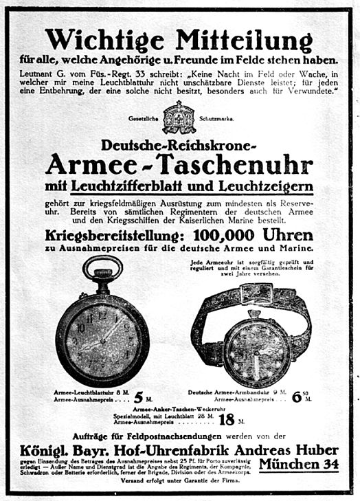 Sekundeneinteilung besitzen. (Separater Sekundenkranz).Diese Militäruhren fanden natürlich insbesondere ab 1914 reißenden Absatz,